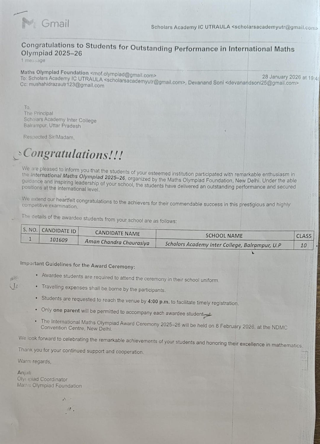 बलरामपुर। स्कॉलर एकेडमी इण्टर कॉलेज बलरामपुर के छात्र अमर चन्द्र चौरसिया को अंतर्राष्ट्रीय गणित ओलंपियाड 2025-2026 में दिल्ली स्थित एन0डी0एम0सी0 कन्वेंशन सेण्टर में पुरस्कार देकर सम्मानित किया जाएगा।