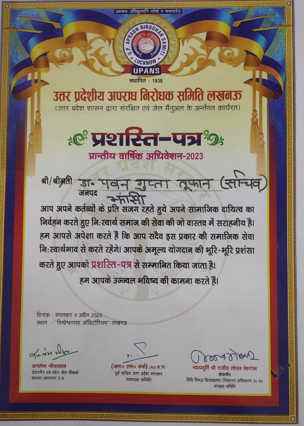 उत्तर प्रदेश शासन द्वारा संरक्षित एवं जेल मैनुअल के अंतर्गत कार्यरत उत्तर प्रदेशीय अपराध निरोधक समिति लखनऊ के चेयरमैन व समस्त कारागार उत्तर प्रदेश के पदेन जेल वीक्षक कमलेश श्रीवास्तव के द्वारा झांसी के वरिष्ठ साहित्यकार व पत्रकार डॉ. पवन गुप्ता “तूफान” को जिला अपराध निरोधक समिति का जिला मंत्री व सचिव एवं झांसी कारागार का पदेन जेल पर्यवेक्षक नियुक्त किया गया। मालूम हो कि यह समिति उत्तर प्रदेश शासन द्वारा गठित है जिसमें शासनादेश के अंतर्गत उत्तर प्रदेश के महामहिम राज्यपाल इस समिति के पदेन संरक्षक ,समाज कल्याण मंत्री पदेन प्रदेश अध्यक्ष व समस्त जिला स्तर पर जिलाधिकारी इस समिति के पदेन अध्यक्ष होते हैं और समिति का जिला मंत्री व सचिव संबंधित जिला कारागार का पदेन जेल पर्यवेक्षक होता है। डॉ पवन तूफान की नियुक्ति के साथ-साथ जिला अपराध निरोधक समिति के अन्य पदाधिकारियों का चयन कार्यक्रम का आयोजन बाहर खंडेराव गेट स्थित गणेश सत्संग भवन में समिति के प्रदेश चेयरमैन व पदेन जेल वीक्षक समस्त कारागार उत्तर प्रदेश कमलेश श्रीवास्तव की अध्यक्षता में एवं समिति के बुंदेलखंड प्रभारी चंद्रशेखर एडवोकेट के आतिथ्य में किया गया जिसमें वरिष्ठ पुलिस अधीक्षक झांसी को जिला चेयरमैन , हरविंदर सिंह वरिष्ठ उपाध्यक्ष, अवधेश निरंजन उपाध्यक्ष, रामकुमार अंकशास्त्री समिति संयोजक, देवेश साहनी कोषाध्यक्ष, बिपिन बिहारी वर्मा संयुक्त कोषाध्यक्ष ,निधि गुप्ता कार्यालय सचिव ,प्रीतिका भदोरिया व रमन शर्मा संयुक्त कार्यालय सचिव, तनुजा कुशवाहा सहायक सचिव, आशुतोष द्विवेदी संयुक्त सहायक सचिव, डॉ रमेश कुमार दुबे जनसंपर्क सचिव ,अरविंद वशिष्ठ संयुक्त जनसंपर्क सचिव ,इंजी. रविकांत दुबे संगठन सचिव, अभय जैन संयुक्त संगठन सचिव ,राकेश सेन संयुक्त सचिव, श्याम शरण नायक एडवोकेट ऑडिटर ,डॉ एस. ए.खान सलाहकार सचिव, नरेश अग्रवाल सांस्कृतिक सचिव ,इस्माइल खान संयुक्त सांस्कृतिक सचिव ,राजीव शुक्ला प्रचार प्रसार सचिव, सीताराम कुशवाहा संयुक्त प्रचार प्रसार सचिव, मनोरमा शर्मा महिला संगठन सचिव, किरण दुबे संयुक्त सचिव, एवं प्रवीण कुमार अग्रवाल को सहायक सचिव समायोजन मनोनीत किया गया।