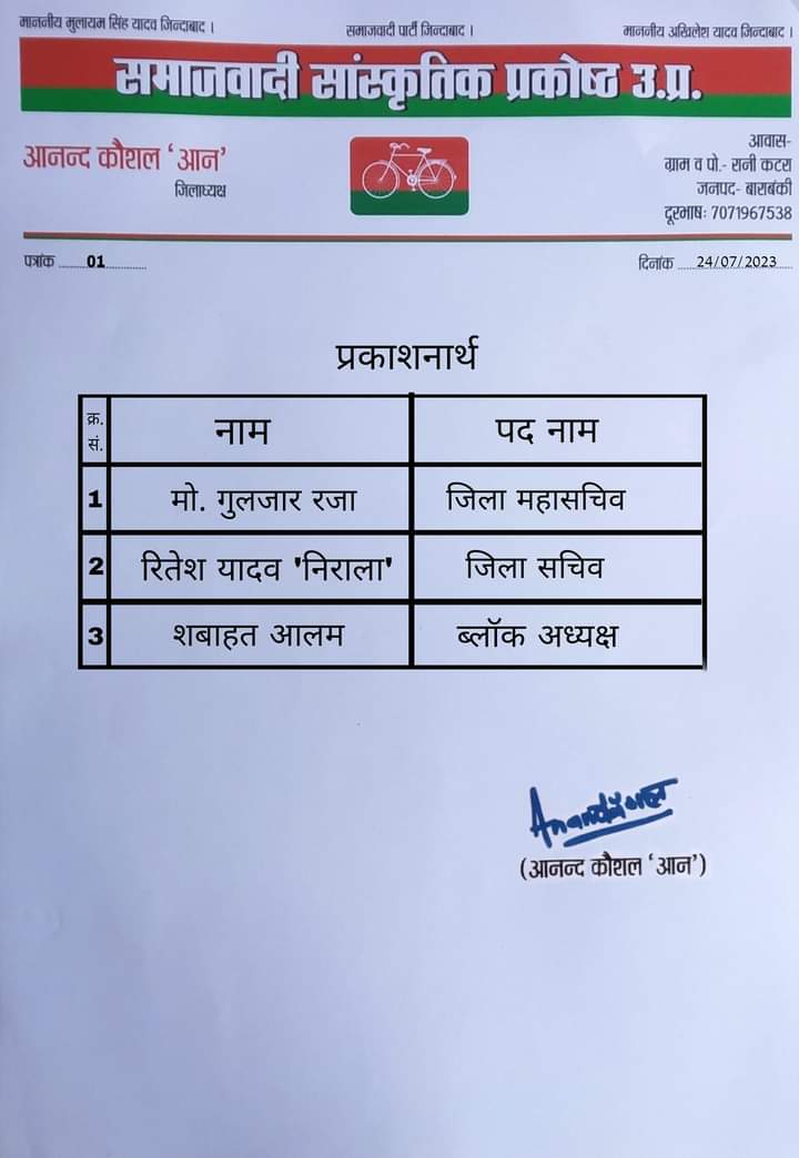 बाराबंकी के दरियाबाद विधानसभा में अपनी अलग पहचान अपने संघर्ष से बनाने वाले गुलजार रजा को संस्कृति प्रकोष्ठ का जिला महासचिव बनाया गया उससे पहले गुलजार रजा ने माननीय मुलायम सिंह यादव यूथ ब्रिगेड विधानसभा मीडिया प्रभारी के पद पर काम कर चुके हैं और उसी से अपनी संघर्ष की अलग पहचान बनाई पूर्व कैबिनेट मंत्री समाजवादी पार्टी के राष्ट्रीय सचिव अरविंद सिंह गोप ने गुलजार रजा के काम को देते हुए रजा रजा को कई बार सम्मानित किया और दरियाबाद मैं अपनी अलग पहचान बना समाजवादी शायर . और जब गुलजार रजा को पद दिया गया तो गुलजार रजा ने जिले के बड़े-बड़े नेताओं को अपना दीवाना बना दिया गुलजार रजा ने वहां पर गीत सुनाए पूर्व रक्षा मंत्री पूर्व मुख्यमंत्री उत्तर प्रदेश स्वर्गीय श्री मुलायम सिंह यादव जी के ऊपर एक गीत सुनाइए जख्म तो आएगा मल्हन नहीं आने वाला सादगी का लिए परचम नहीं आने वाला आने वाली कई सदियों को तरसना होगा दूसरा कोई मुलायम नहीं आना. और गुलजार छानी का संस्कृत प्रकोष्ठ के प्रदेश अध्यक्ष भोजपुरी गायक श्री धर्मेंद्र सोलंकी एवं जिला अध्यक्ष संस्कृत प्रकोष्ठ जिला बाराबंकी की पूरी टीम को हृदय से आभार और मैं भरोसा दिलाता हूं आप लोगों ने मुझे इस पद के लायक हूं आप लोगों को मैं भरोसा दिलाता इसी तरह से मेहनत करता जय समाजवाद समाजवादी