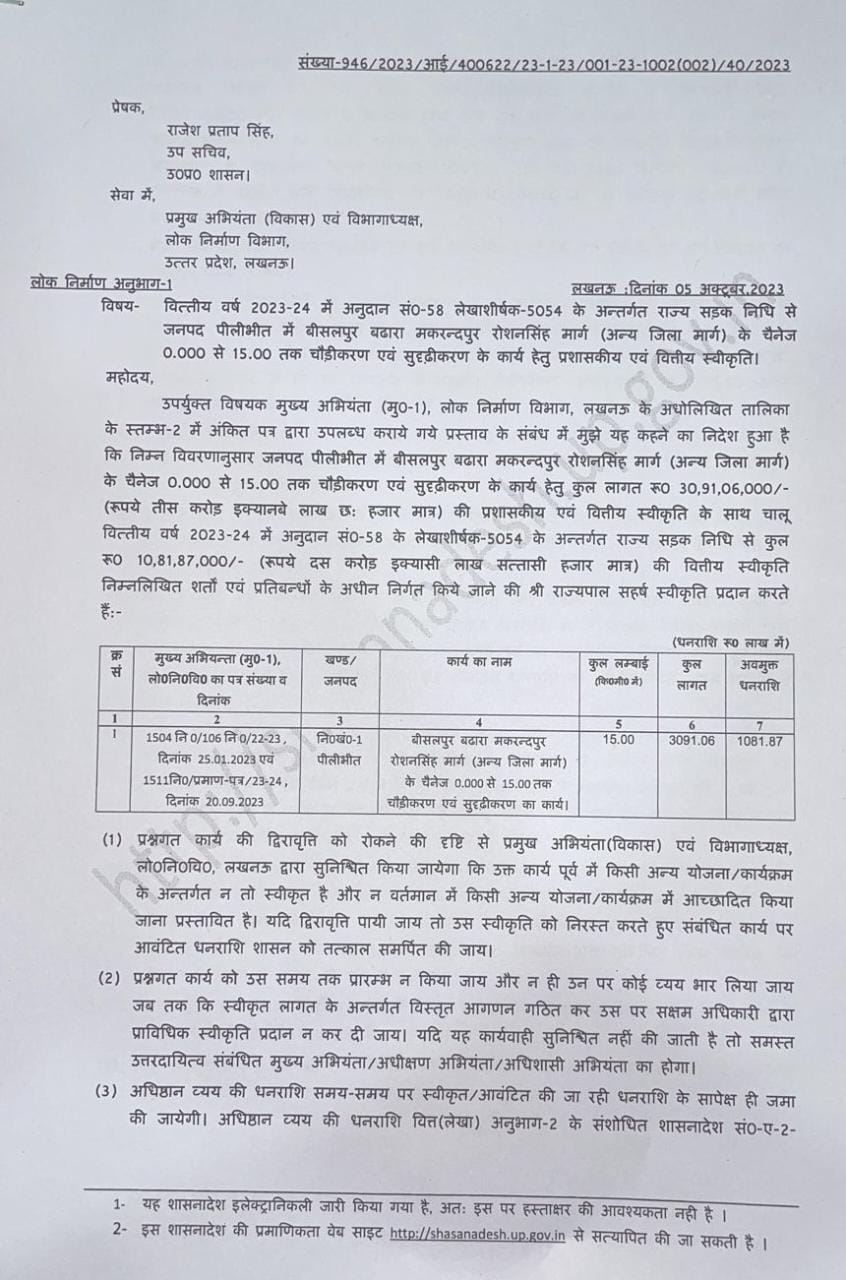 बीसलपुर, बढ़ैरा, मकरंदपुर रोशन सिंह सड़क मार्ग का चौड़ीकरण जल्द शुरू होगा जिसकी धनराशि शासन द्वारा स्वीकृत की जा चुकी है जिसको लेकर क्षेत्र वासियों में खुशी की लहर दौड़ गई है। बताया जा रहा है कि मकरंदपुर रोशन सिंह में माला नदी पर लघु सेतु की स्वीकृति मिल गई है । जल्द ही निर्माण कार्य शुरू होने की उम्मीद लगाई जा रही है।इसी क्रम में शासन द्वारा बीसलपुर, बढ़ैरा व मकरंदपुर रोशन सिंह सड़क मार्ग पर 15 किलोमीटर तक चौड़ीकरण एवं सुदृढ़ीकरण हेतु शासन द्वारा तीस करोड़ इक्यानवे लाख छः हजार रुपए की स्वीकृति उत्तर प्रदेश शासन के उपसचिव राजेश प्रताप सिंह द्वारा प्रमुख अभियंता लोक निर्माण विभाग लखनऊ को भेजे एक पत्र में दी गई है जिसमें दस करोड़ इक्यासी लाख सतासी हजार रुपए की स्वीकृति राज्यपाल महोदय द्वारा निर्गत कर दी गई है। अभी तक यह सड़क खस्ताहाल और जर्जर स्थिति में पहुंच गई है । इस सड़क मार्ग से मधवापुर, मकरंदपुर रोशन सिंह, बढ़ैरा,बेनीपुर,गझाड़ा, गझेड़ी, सहित दर्जनों गांवों का सीधा आवागमन रहता है। सिंगल और खस्ताहाल सड़क होने के कारण हमेशा दुर्घटना का खतरा बना रहता है । सड़क चौड़ीकरण एवं सुदृढ़ीकरण की स्वीकृति प्रदान होने की सूचना मिलते ही क्षेत्र वासियों में खुशी की लहर दौड़ गई है। उन्हें दशकों से माला नदी पर मकरंदपुर रोशन सिंह में बनने वाले पुल की उम्मीद जगी है। इस पुल के बन जाने से मकरंदपुर रोशन सिंह से सीधे टिकरी का आवागमन शुरू हो जाएगा जिससे दर्जनों गांवों के विकास में चार चांद लग जाएंगे।