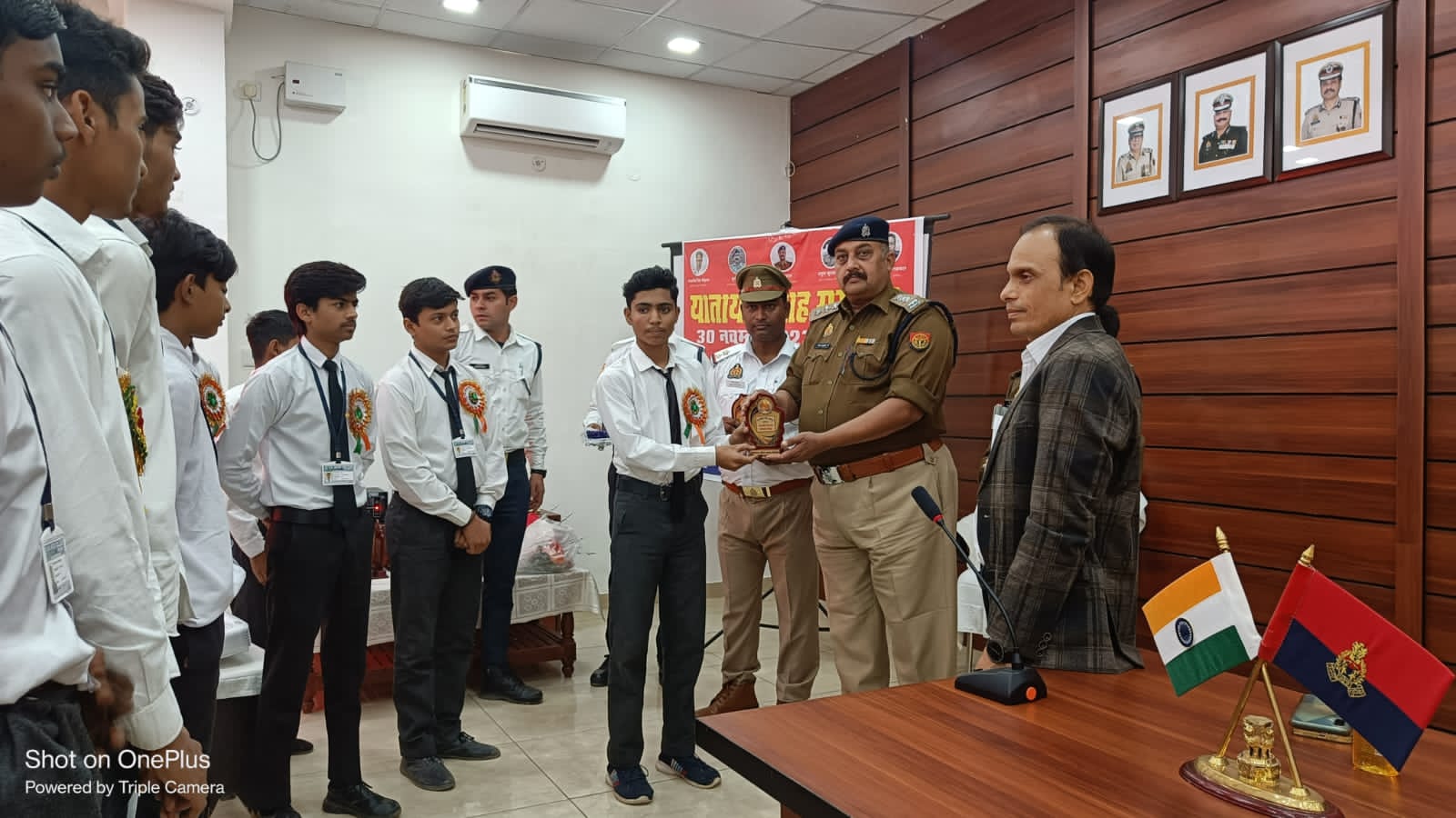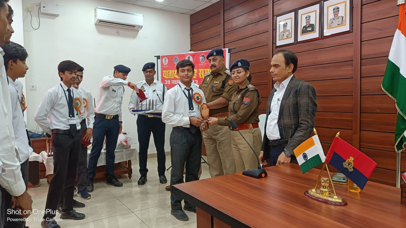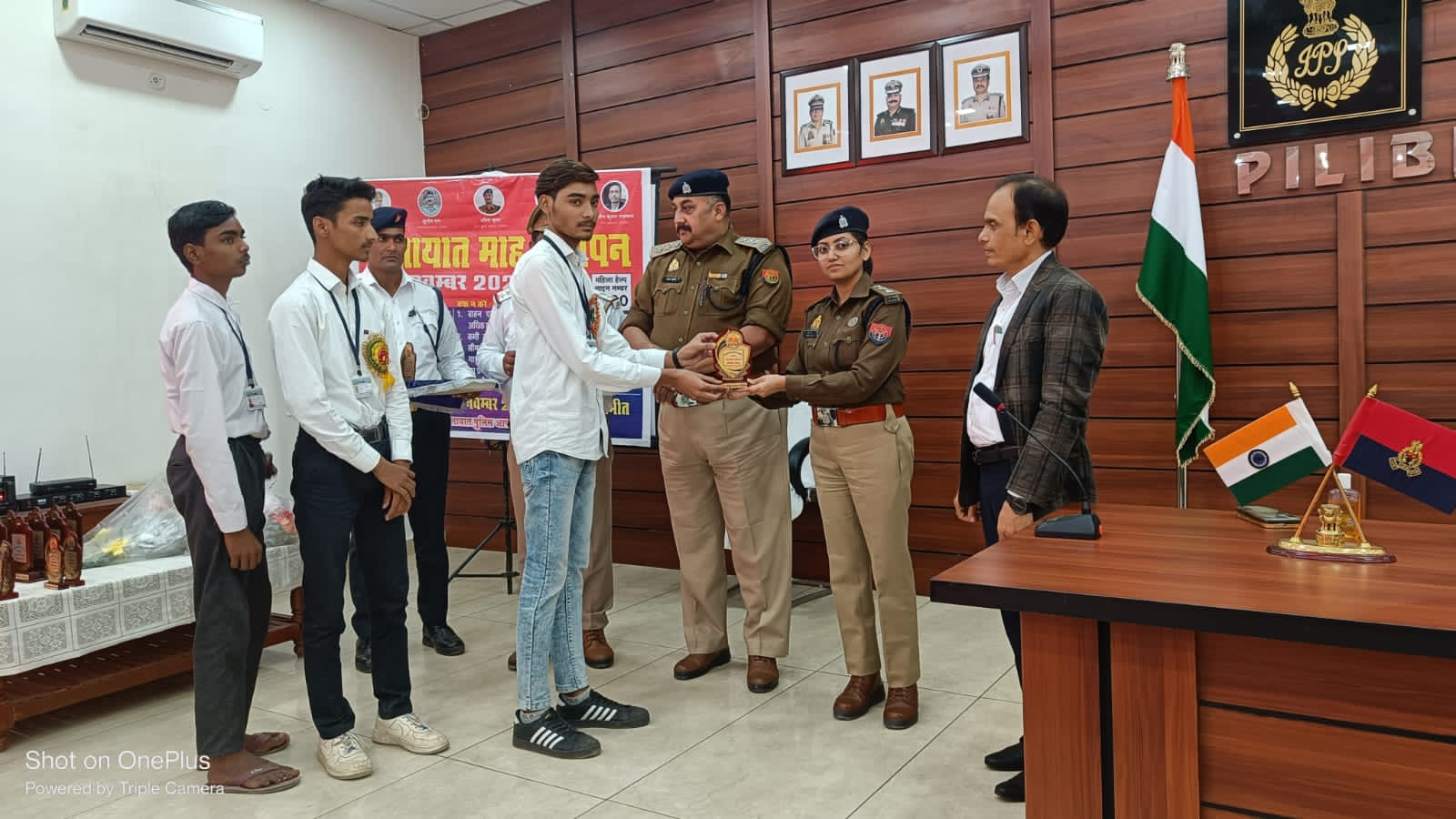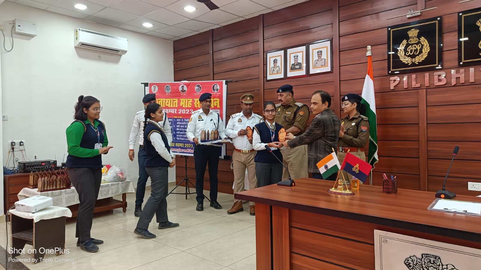 पीलीभीत ÷आज दिनांक 30.11.2023 को पुलिस लाइन प्रेक्षागृह में यातायात माह-नवम्बर 2023 का समापन किया गया। यातायात जागरुकता के क्रम में ए आर टी ओ वीरेन्द्र सिंह व क्षेत्राधिकारी लाइन दीपक चतुर्वेदी, क्षेत्राधिकारी नगर अंशू जैन की उपस्थिति मे जनपद मे निबन्ध लेखन, चित्रकला व क्विज प्रतियोगिता मे मेधावी छात्र/छात्राओं को यातायात सुरक्षा हेतु जागरूक करते हुए ट्रैफिक नियमों एवं सड़क दुर्घटनाओं से बचने हेतु आवश्यक जानकारी देकर जागरूक किया गया । विगत वर्षो की भांति इस वर्ष भी शासन के निर्देशानुसार नवंबर माह को यातायात माह के रूप में मनाया गया है। कार्यक्रम के दौरान हेलमेट पहनने, सेफ्टी बेल्ट लगाने हेतु प्रेरित करते हुए सावधानी पूर्वक रोड पर चलने, यातायात नियमों का पालन करने हेतु विस्तार पूर्वक बताया गया एवं रोड सेफ्टी के प्रति लोगो को जागरुक किया गया तथा यातायात नियमों के प्रति जागरुक रहकर उनका पालन करने की अपेक्षा की गयी तथा पुरस्कार वितरित किये गये।