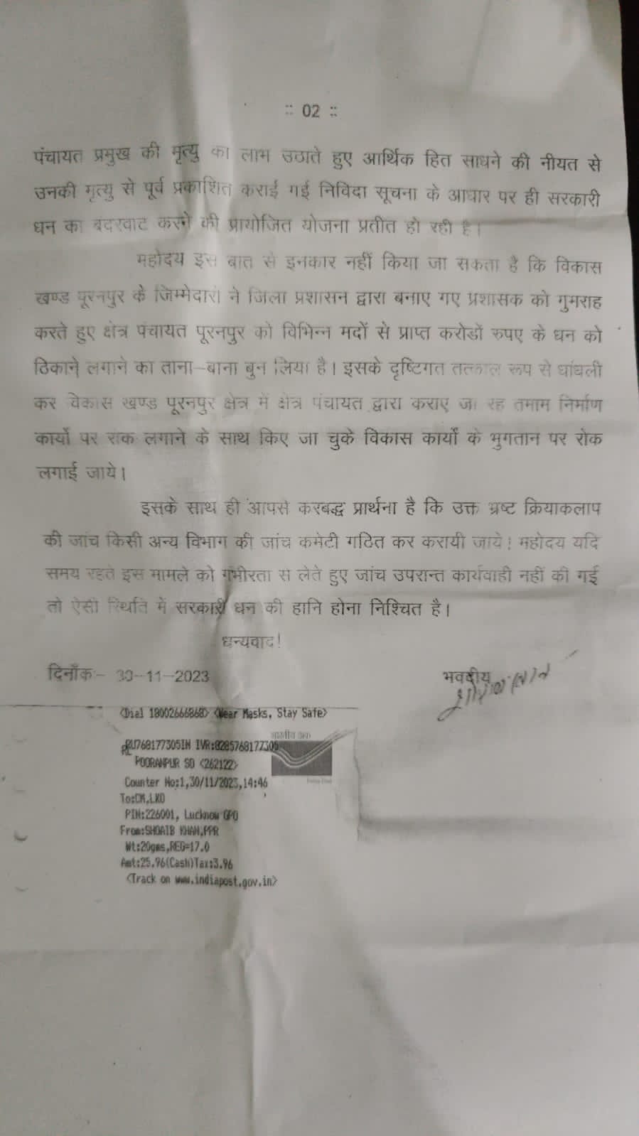 ग्राम पंचायत पूरनपुर देहात के वार्ड नंबर 15 निवासी क्षेत्र पंचायत सदस्य एवं बीडीसी महासंघ के जिला महासचिव शोएब अहमद खान उर्फ फूलबाबू ने मुख्यमंत्री सहित तमाम अधिकारियों को भेजे शिकायती पत्र में कहा कि कि बरेली से प्रकाशित एक समाचार पत्र में 07 सितंबर 2023 को खण्ड विकास अधिकारी, पूरनपुर द्वारा क्षेत्र पंचायत पूरनपुर के अंतर्गत 15वां अनटाईड, टाइड, पंचम मरम्मत, पंचम राज्य वित्त योजना अंतर्गत 77 विकास कार्य कराये जाने हेतु निविदा सूचना प्रकाशित कराई गई थी। जिसमें 25 सितंबर 2023 की अपराह्न 02 बजे तक निविदाएं आमंत्रित की गई थी जोकि उसी दिन शाम 04 बजे खोली जानी थी। शिकायत में कहा गया कि निविदाएं प्राप्त होने अथवा खुलने से पूर्व 20 सितंबर 2023 को क्षेत्र पंचायत प्रमुख कमलेश्वरी दीक्षित का लंबी बीमारी के चलते देहांत हो गया था। क्षेत्र पंचायत प्रमुख के देहांत के उपरांत उनके समय में उनके आदेशानुसार बीडीओ द्वारा समस्त उक्त विकास कार्य के लिए निकाली जाने वाली निविदा सूचना नियमानुसार निरस्त अथवा स्थगित की जानी चाहिए थी। तत्पश्चात जिला प्रशासन द्वारा बनाए गए प्रशासक के आदेश अनुसार पुनः निविदा सूचना के प्रकाशन उपरांत ने निविदाएं प्राप्त होने पर समस्त विकास कार्यों को कराया जाना चाहिए था। परंतु खंड विकास अधिकारी द्वारा किसी भी समाचार पत्र में निविदा सूचना का प्रकाशन कराए बिना कर नियमों को ताक पर रखते हुए क्षेत्र पंचायत प्रमुख की मृत्यु का लाभ उठाते हुए आर्थिक हित साधने की नीयत से उनकी मृत्यु से पूर्व प्रकाशित कराई गई निविदा सूचना के आधार पर ही सरकारी धन का बंदरवाट करने की प्रायोजित योजना बना ली। शिकायत में कहा गया कि इस बात से इनकार नहीं किया जा सकता है कि विकास खंड पूरनपुर के जिम्मेदारों ने जिला प्रशासन द्वारा बनाए गए प्रशासक को गुमराह करते हुए क्षेत्र पंचायत पूरनपुर को विभिन्न मदों से प्राप्त करोड़ों रुपए के धन को ठिकाने लगाने का ताना-बाना बुन लिया है। इसके दृष्टिगत तत्काल रूप से धांधली कर विकास खंड पूरनपुर क्षेत्र में क्षेत्र पंचायत द्वारा कराए जा रहे तमाम निर्माण कार्यों पर रोक लगाने के साथ किए जा चुके विकास कार्यों के भुगतान पर रोक लगाई जाये। इसके साथ ही उक्त भ्रष्ट क्रियाकलाप की जांच किसी अन्य विभाग की जांच कमेटी गठित कर करायी जाये। बीडीसी महासंघ के जिला महासचिव फूलबाबू ने कहा कि यदि समय रहते इस मामले को गंभीरता से लेते हुए जांच उपरांत कार्यवाही नहीं की गई तो ऐसी स्थिति में सरकारी धन की हानि होना निश्चित है।